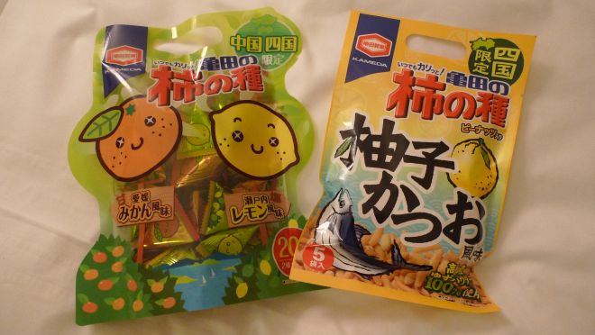 (左)亀田の柿の種 みかん風味&レモン風味