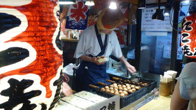 冇入舖頭食就排少少隊睇住章魚帽師傅整章魚燒