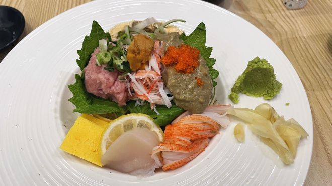 - 香蔥三文魚腩蓉、油甘魚蓉、甜蝦、玉子、蟹柳