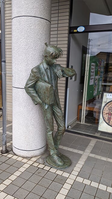 図書館前の新一像、クールにあなたを迎えてくれます。