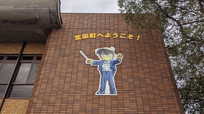 行兩步就抬頭見到北栄町図書館上面有一大個柯南壁面(壁畫)