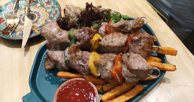 (慢煮西班牙黑毛豬串燒配甜蕃薯角)