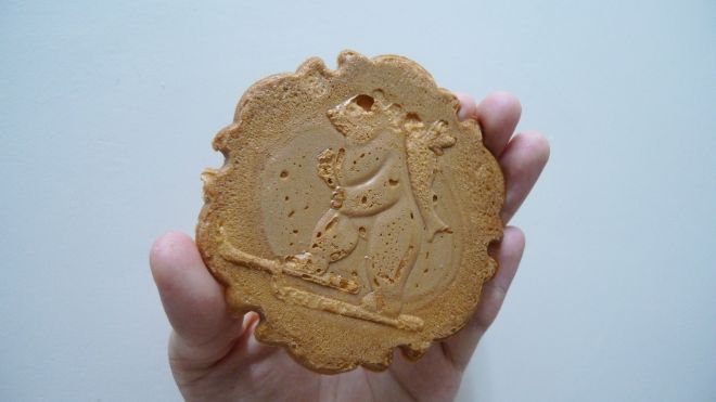 塊餅上印咗隻孭住條魚嘅熊 餅身硬脆嗰種,牛油同牛奶味濃郁 仲有住淡淡蛋香嘅超vintage風味 同有過百年手藝嘅台南煎餅有得揮喔!